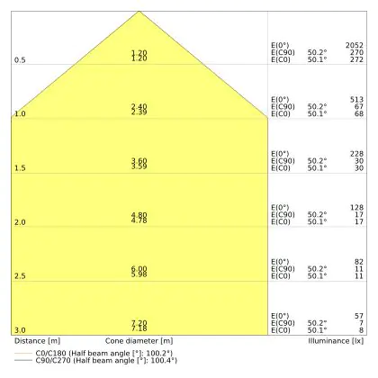 Der Abstrahlwinkel bezeichnet den Winkel, in dem das Licht aus der Lichtquelle ausgestrahlt wird. Er wird in Grad (D) angegeben. Je geringer die Gradzahl des Abstrahlwinkels ist, desto kleiner ist auch der Durchmesser des Lichtkegels, den die Lichtquelle produziert. Beispiel: Wird eine Lampe mit einem Abstrahlwinkel von 60 Grad an der Decke (2,5 m Höhe) angebracht, erzeugt sie einen Lichtkegel von 2,9 Metern Durchmesser. Hat die Lampe hingegen einen Abstrahlwinkel von 120 Grad, beträgt der Lichtkegel 8,7 Meter im Durchmesser. |