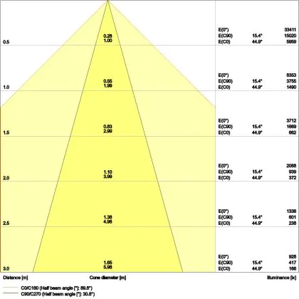 Der Abstrahlwinkel bezeichnet den Winkel, in dem das Licht aus der Lichtquelle ausgestrahlt wird. Er wird in Grad (D) angegeben. Je geringer die Gradzahl des Abstrahlwinkels ist, desto kleiner ist auch der Durchmesser des Lichtkegels, den die Lichtquelle produziert. Beispiel: Wird eine Lampe mit einem Abstrahlwinkel von 60 Grad an der Decke (2,5 m Höhe) angebracht, erzeugt sie einen Lichtkegel von 2,9 Metern Durchmesser. Hat die Lampe hingegen einen Abstrahlwinkel von 120 Grad, beträgt der Lichtkegel 8,7 Meter im Durchmesser. |