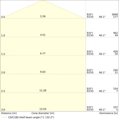 Der Abstrahlwinkel bezeichnet den Winkel, in dem das Licht aus der Lichtquelle ausgestrahlt wird. Er wird in Grad (D) angegeben. Je geringer die Gradzahl des Abstrahlwinkels ist, desto kleiner ist auch der Durchmesser des Lichtkegels, den die Lichtquelle produziert. Beispiel: Wird eine Lampe mit einem Abstrahlwinkel von 60 Grad an der Decke (2,5 m Höhe) angebracht, erzeugt sie einen Lichtkegel von 2,9 Metern Durchmesser. Hat die Lampe hingegen einen Abstrahlwinkel von 120 Grad, beträgt der Lichtkegel 8,7 Meter im Durchmesser. |