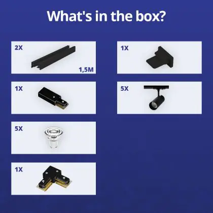 | Nom du fabricant | Complete L shaped 1-Phase Track Set Black incl. 5x Spot fixture + GU10 2700K 3W Dim – 1,5 x 1,5 mete | |